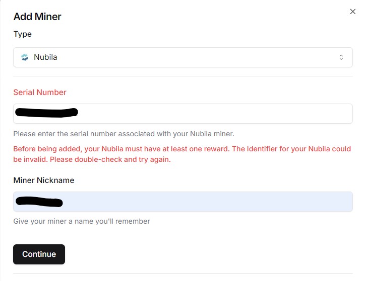 I am having a similar issue. It has been running for over 3 days and I have rewards in my nubila app but can’t sign up to the tracker.